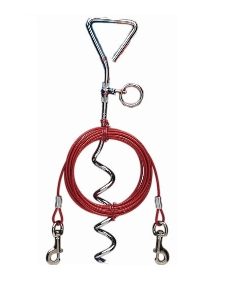 This 20′ cable tie out comes with a 16″ long spiral stake that is easily twisted into the ground and keeps your dog from pulling it out and running off.• 20 ft. Cable tie out• 16 in. spiral stake• Easily installed