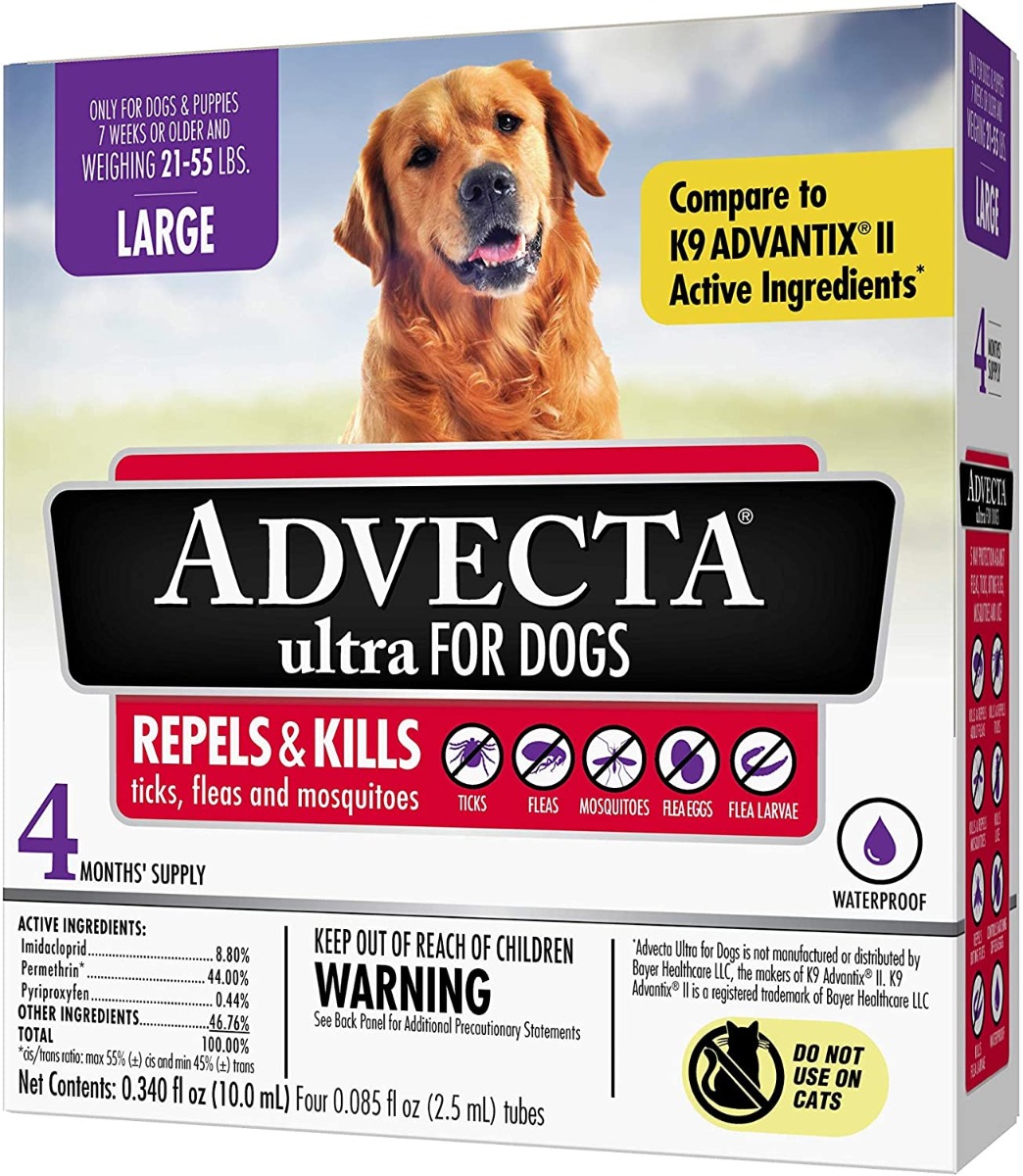Advecta Ultra® Flea & Tick Protection for Dogs contains the same active ingredients as K9 Advantix® for Dogs*. This fast-acting, long-lasting, waterproof formula kills and repels fleas, ticks, and mosquitoes – all while breaking the flea lifecycle by killing flea eggs, flea larvae, and chewing lice for up to 30 days.