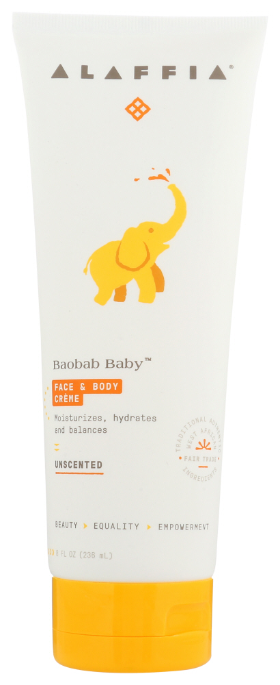 Alaffia’s baobab baby face & body crème is gentle and unscented for baby’s delicate skin. Handcrafted with fair trade unrefined shea butter and baobab from Alaffia’s West Africa cooperatives.