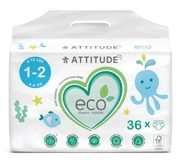 ATTITUDE: Biodegradable Baby Diapers Size 1 and 2, 36 un