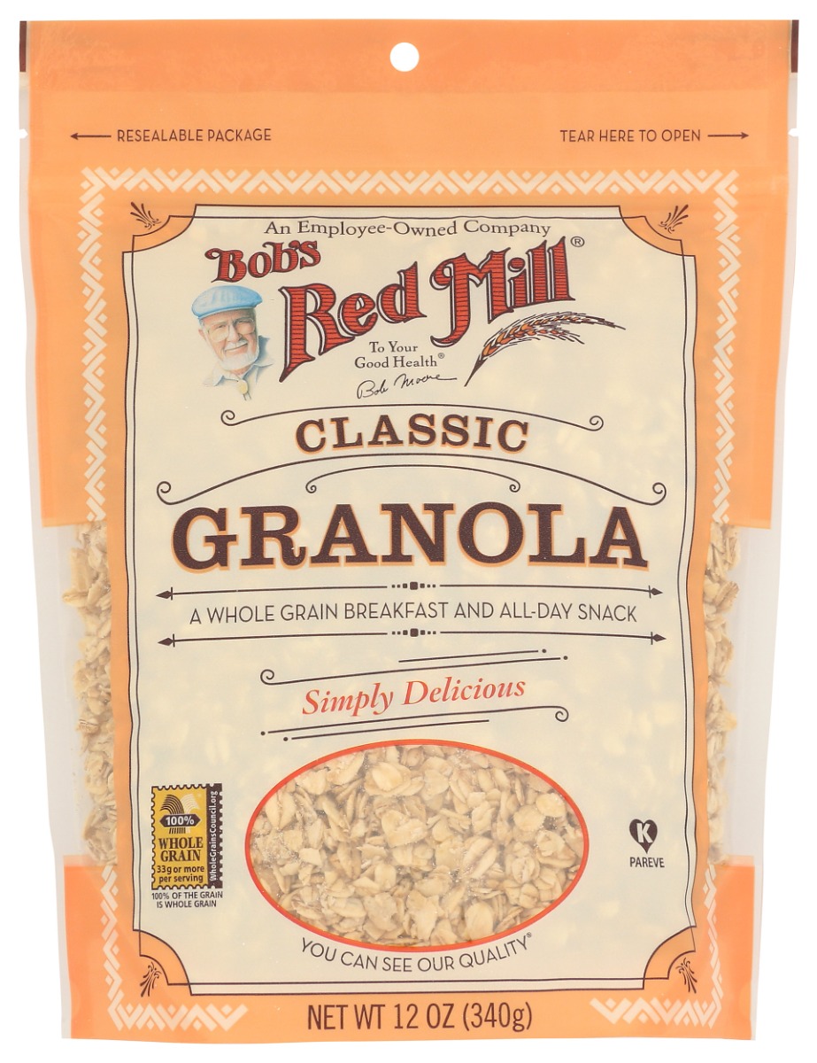 Our 12 oz Classic Granola now comes in a stand-up, resealable package!Bob’s Red Mill Natural Classic Granola is a scrumptious and easy way to enjoy the goodness of whole grains. This granola features ingredients like whole grain oats, natural vanilla and pure cane sugar, but you can make it your own with dried fruit, chocolate chips, maple syrup or brown sugar, and cinnamon or other spices. Sprinkle it over Greek yogurt, drizzle it with honey, or top it with peanut butter or fresh fruit.Our Classic Granola is a good source of fiber and iron and offers 5 grams of protein per serving. Enjoy it today for breakfast or take it on the road as a nourishing snack!
