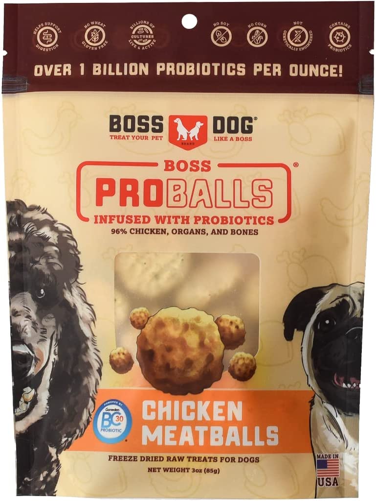 Boss Dog® Brand BOSS PROBALLS™ are protein based treats to support overall health and with a taste your dog is sure to enjoy! These delicious freeze dried raw meatballs are packed with probiotics at over 1 Billion Probiotics per ounce!