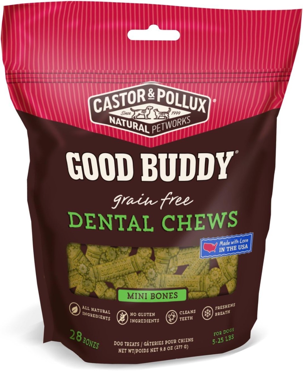 Castor & Pollux Good Buddy Grain Free Dental Chews Mini Bones offer dogs an all-natural chew designed for fighting tartar and plaque and for naturally freshening breath. Compared to other dental chews, Good Buddy Dental Chews are grain free and contain no gluten ingredients. They are made with all-natural ingredients without sorbic acid or sodium copper chlorophylin.