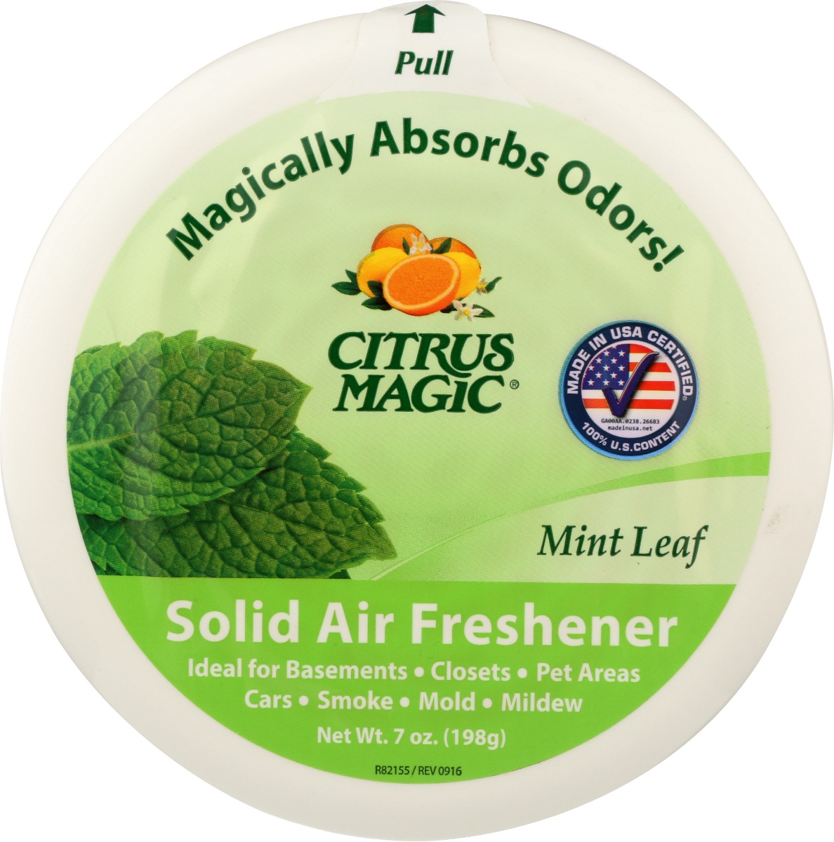 Citrus Magic® Solid Air Freshener magically absorbs bad odors and freshens the air, naturally! Our unique formula uses baking soda increasing its odor absorbing power. Odors are eliminated and the clean Mint Leaf scent freshens the air.