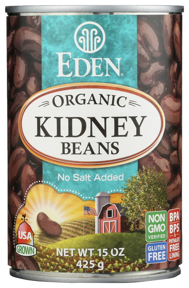Organic U.S.A. family farm large red kidney beans soaked overnight and thoroughly cooked at Eden’s certified organic and kosher cannery with purified water and zero chemical additives.