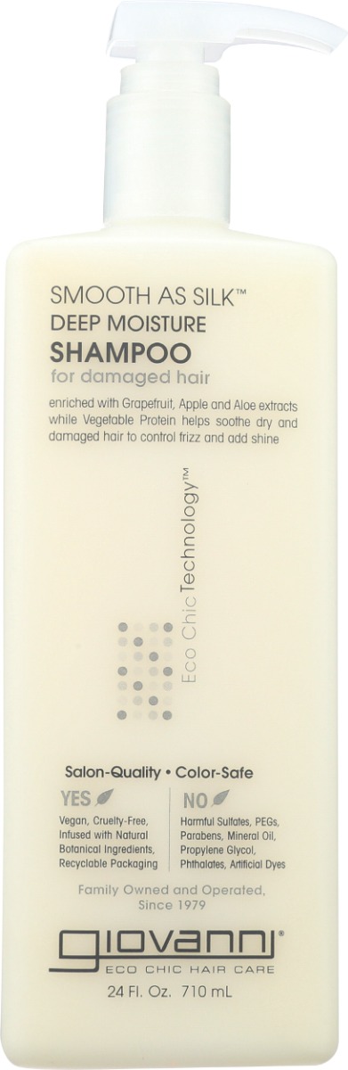 Soft and smooth, sexy and sultry. Smooth As Silk™ Deep Moisture Shampoo has a pearlized formula that glistens in your hand and transforms your hair into a silky palette. New and improved formulation with Apple and Aloe extracts provide antioxidant protection and enhanced moisturizers for even silkier hair. Lather and glow with the flow that begins your style. Smooth As Silk™ Deep Moisture Shampoo wears beautifully on you.This sulfate-free shampoo will not dull, strip, or damage your hair. It’s color-safe, paraben-free, and cruelty-free. Look in the Ingredients tab for a listing of USDA certified organic ingredients.Giovanni hair care…bridging the gap between natural and salon quality.Pearlized formula glistens in your hand and transforms hair into a silky palette. Lather and glow while prepping for your best style. Luxurious lather soothes dry, chemically processed hair. Cleanses gently for manageable smoothness. Calms unruly hair to alleviate frizz. Increases shine while smoothing dry or damaged hair.