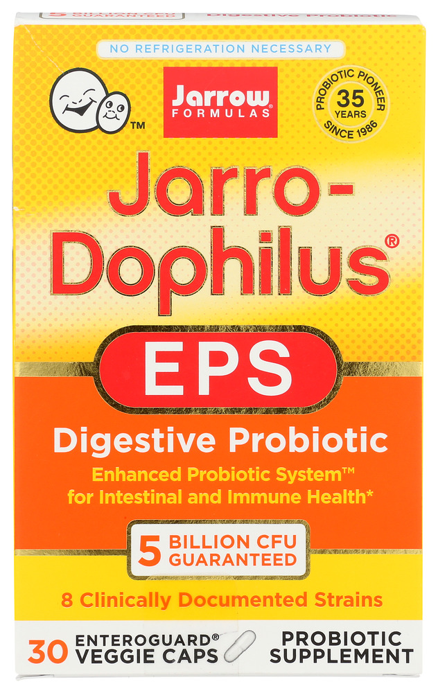 Jarro-Dophilus® EPS is an Enhanced Probiotic System™ formula due to its proprietary EnteroGuard® coating, blister packing defense against air and moisture, and use of strains with excellent stability at room temperature. This ensures a maximum number of probiotic strains are delivered to the intestinal tract, where they can fully exert their benefits. Jarro-Dophilus® EPS is a shelf-stable, multi-strain probiotic formulated with clinically documented strains.