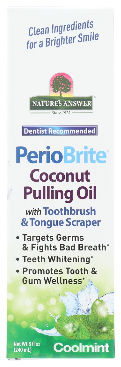 PerioBrite® Coconut Pulling Oil is the real deal for targeting germs, fighting bad breath, teeth whitening, and promoting overall tooth and gum wellness*. It’s not simply a social media trend, the PerioBrite® Coconut Pulling Oil pulling has its origins in Ayurvedic holistic medicine dating from 3,000 to 5,000 years ago. Coconut Pulling Oil is the newest addition to the PerioBrite® family of products. It is made with 100% fractionated coconut oil unlike other brands that use sesame or vegetable oil blends. Nature’s Answer CoconutPulling Oil is made with our wildcrafted herbs and premium blend of pure essential oils.