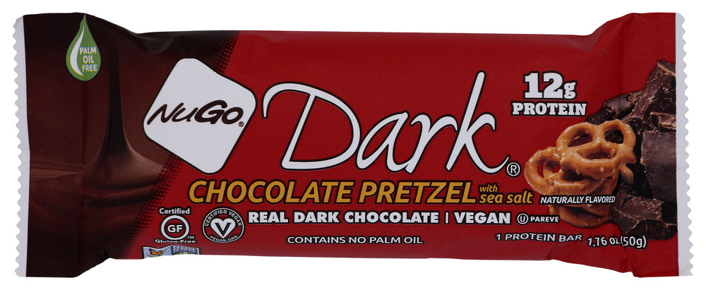 Can’t decide if you want something salty or sweet? What’s better than a chocolate pretzel to satisfy those cravings? The crisp combination of delicious Real Dark Chocolate and crunchy pretzels sprinkled with sea salt will please your senses. Each NuGo Dark bar has 10g protein and contains top quality, gluten free, vegan ingredients.
