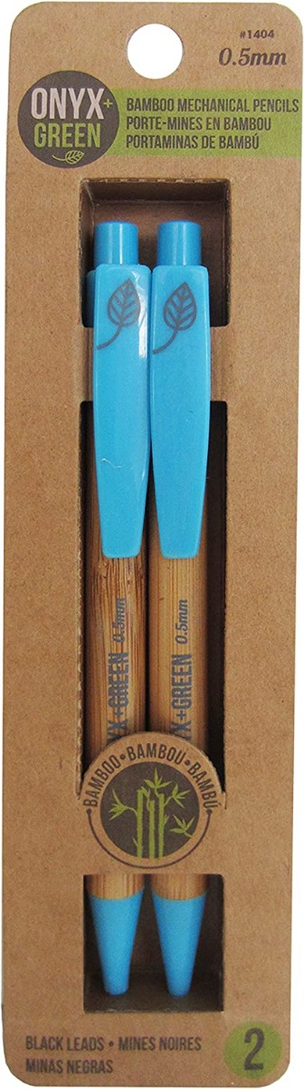 Onyx + Green’s classic bamboo mechanical pencils come in a package of 2 with light blue clips and tip. They use 0.5mm lead. Make sure to check out other items made from bamboo!