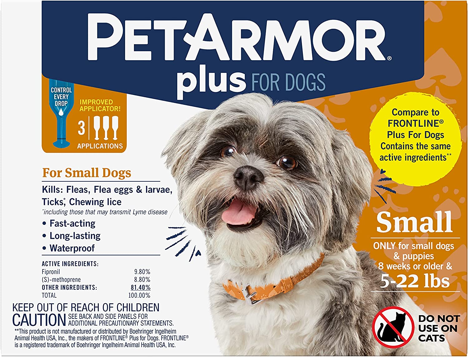 PetArmor Plus is a waterproof, flea & tick topical prevention for dogs that kills fleas, flea eggs, flea larvae, ticks, and chewing lice for up to 30 days after application. Containing fipronil and (S)-methoprene, the same active ingredients as FRONTLINE Plus for Dogs. PetArmor Plus for Dogs has a powerful formula that starts to kill fleas within 24 hours.