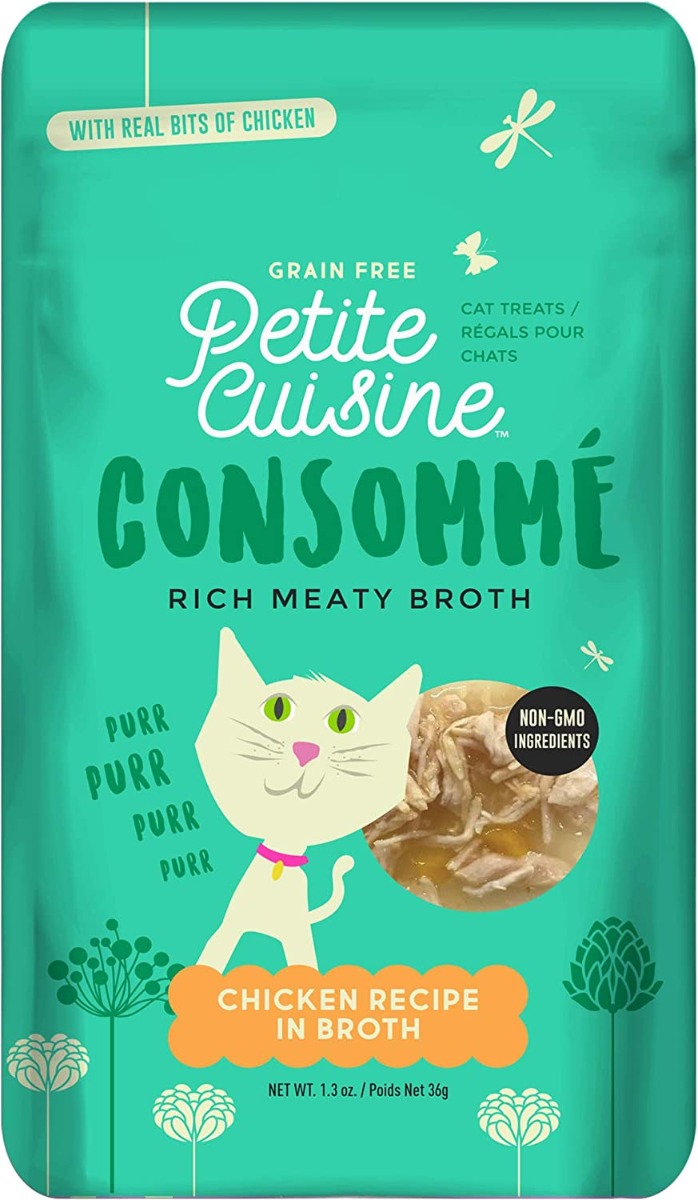 This delicious, meaty consommé has real bits of chicken to entice the most discerning feline taste buds. Add moisture to your cat’s diet by topping dry food or serving alone as a treat anytime!