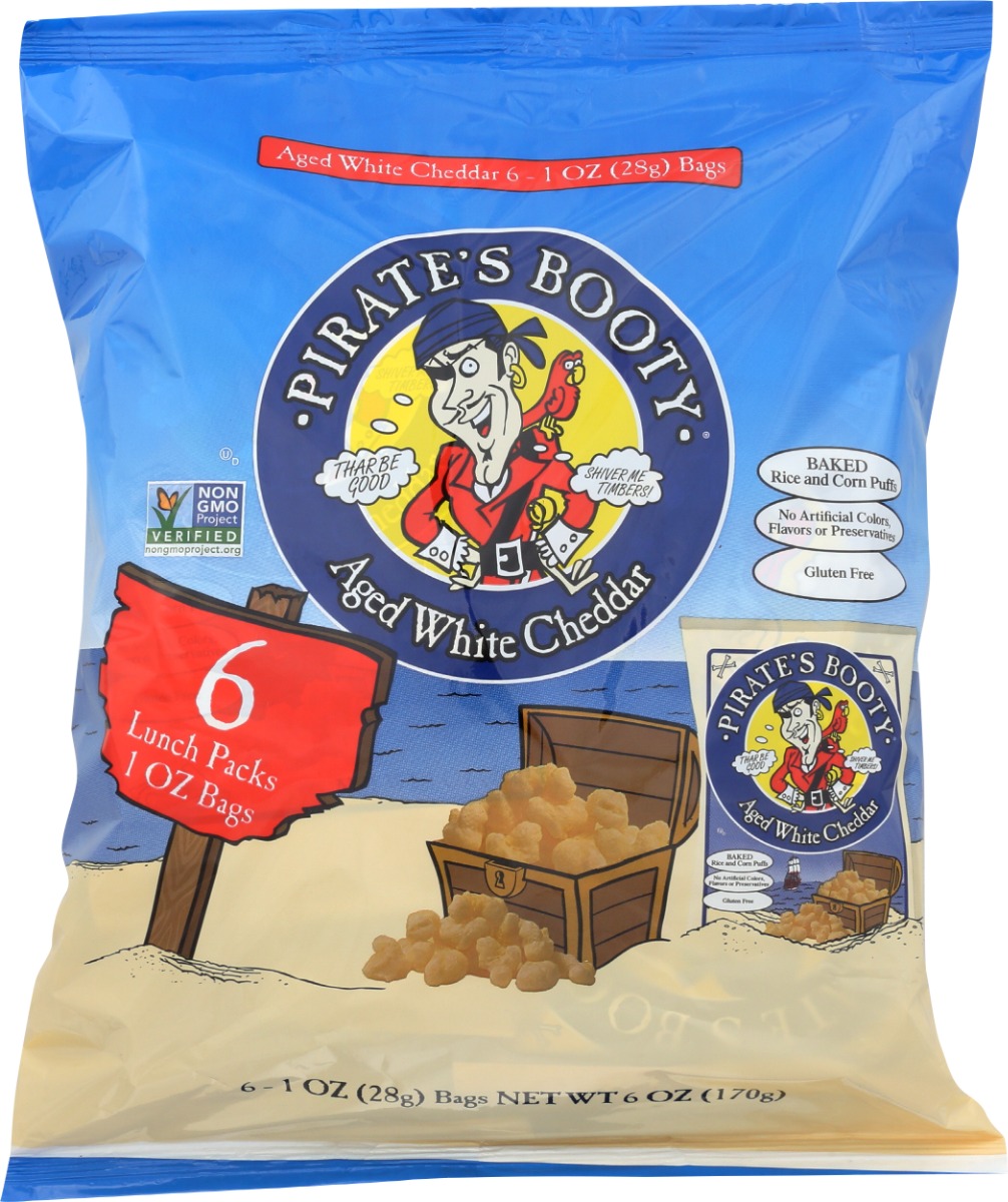 Hoist the sails and prepare to taste a treasure of the ages with PIRATE’S BOOTY Aged White Cheddar made from rice and corn. Each bag is gluten free with no artificial colors. Blended with real aged white cheddar cheese and baked to pirate perfection, keep these 1 oz bag of puffs stocked for lunchboxes or voyages on the go!