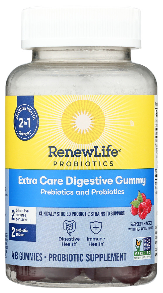 Want a convenient way to get the benefits of probiotics? Enter Renew Life® Extra Care Digestive Gummy! With clinically studied strains, prebiotics and yummy raspberry flavor, it makes taking an effective probiotic fun and easy.*