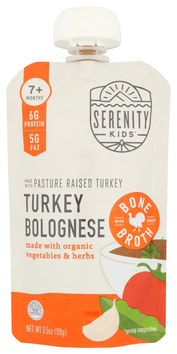 Our delicious Turkey Bolognese is made with organic free range turkey bone broth, pasture raised turkey from small American regenerative family farms, with a hint of tomato and basil. These nutrient-packed toddler purees are a great source of vitamins, antioxidants, and minerals, that helps your growing little one learn to enjoy complex flavors and sets them up for healthier eating. Why bone broth? Bone broth is rich in easily digestible protein and amino acids. With the addition of gut-healthy veggies and herbs, our Turkey Bolognese can help broaden toddler’s palate, strengthen growing bones and teeth, help build connective tissue and joints, reduce the risk of food sensitivity, and support immunity and digestion. With no added sugars or preservatives, our allergen-free, easy grab and go pouch is the most nutritious low sugar toddler food option for your little one. Make your kid a Serenity Kid!