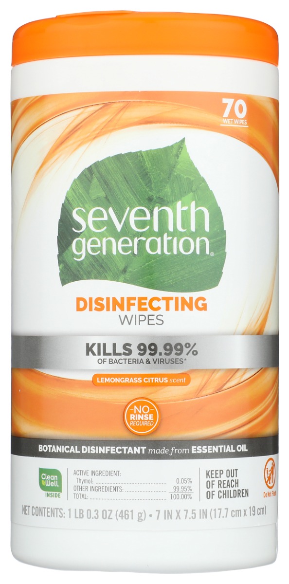 Kills 99.9% of household germs specifically: Influenza A virus, H1N1, Rhinovirus type 37, Methicillin-resistant S. aureus (MRSA), Staphylococcus aureus, Salmonella enterica, and Pseudomonas aeruginosa. CleanWell® proprietary disinfecting technology based on thymol, a component of essential oil. Seventh Generation Disinfecting Wipes has demonstrated effectiveness against viruses similar to SARS-CoV-2 on hard, non-porous surfaces. Therefore, Seventh Generation Disinfecting Wipes can be used against SARS-CoV-2 when used in accordance with the directions for use on the product label on hard non-porous surfaces. Refer to the U.S. Centers of Disease Control and Prevention (CDC) website for additional information. Use these convenient disinfectant wipes that have a light herbal lemongrass citrus oil scent. Effective on non-porous surfaces such as countertops, floors, food preparation surfaces, doorknobs and more.