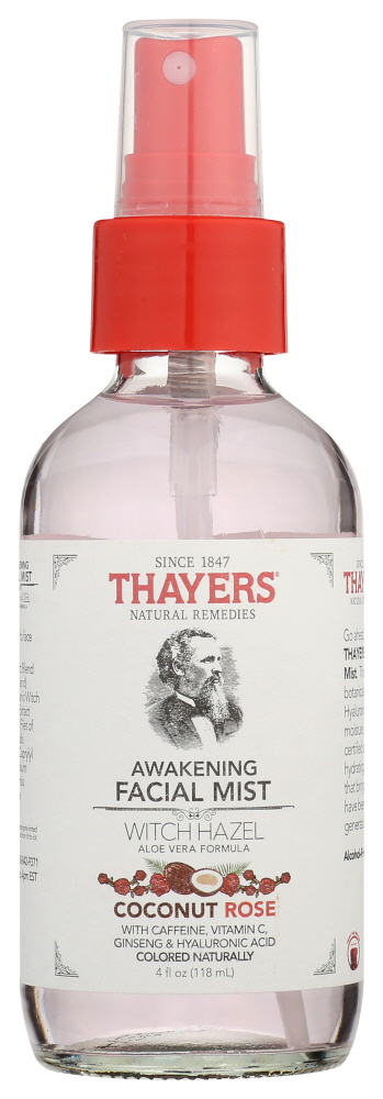 Go ahead, get misty, and face the day with THAYERS® Coconut Rose Awakening Facial Mist. This gentle mist features powerhouse botanicals like caffeine, vitamin c, and ginseng. Hyaluronic acid provides intense, binding moisture, while Thayers proprietary blend of certified organic Witch Hazel and Aloe Vera offer hydrating, antibacterial, and antioxidant benefits that bring about a natural glow. Thayers elixirs have been a fixture of medicine cabinets for generations once you use them, you’ll know why.
